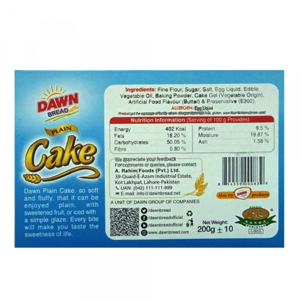 Dawn Cake Way Plain Cake 200g in Pakistan is a soft, fluffy, and delicious cake baked to perfection for a simple yet satisfying taste. With its light texture and balanced sweetness, it makes the perfect companion for tea, coffee, or a quick snack.
