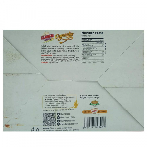 Dawn Strawberry Cupcake Box (6 Pieces) in Pakistan offers soft, fluffy, and delicious cupcakes with the sweet and fruity flavor of strawberries. Lightly moist and perfectly baked, they deliver a delightful taste that kids and adults will love.