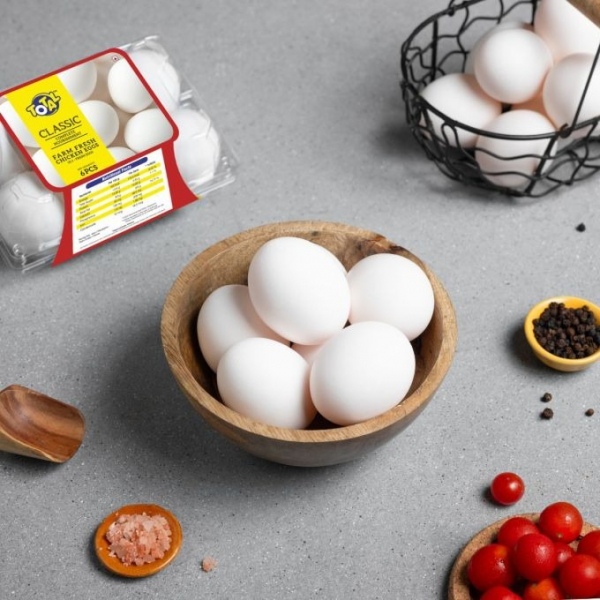 A pack of six fresh, high-quality eggs. Perfect for everyday cooking and baking. These eggs have a rich taste and are an excellent source of protein and essential nutrients. Ideal for breakfast dishes, desserts, and a variety of recipes.