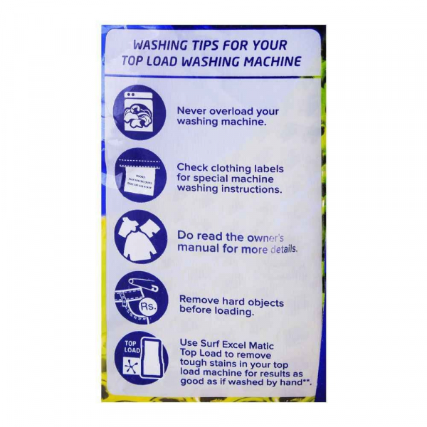 Surf Excel Matic Top Load is specially formulated for top load washing machines, delivering powerful stain removal with minimal effort. Its advanced formula dissolves quickly and penetrates deep into fabric fibers to remove tough stains while keeping clothes bright and fresh. Designed to produce low foam for an efficient wash cycle, it ensures spotless cleanliness and long-lasting fragrance in every load. Trusted by households across Pakistan for superior laundry results.
